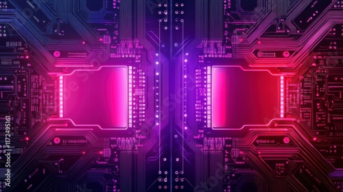 Futuristic circuit board design with glowing microchips and vibrant neon lights creating a high-tech atmosphere