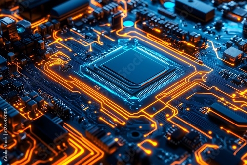 Futuristic Circuit Board with Glowing Orange and Blue Lines Highlighting the Central Processor - High-Tech Electronic Technology Background