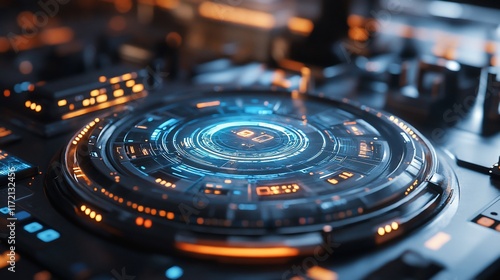 Futuristic circular interface with glowing lights.