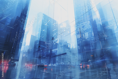 Futuristic city with blurry moving glass buildings and skyscrapers. Use a white and blue theme.