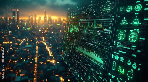 Futuristic Cityscape: A Nighttime View with Advanced Tech Interface