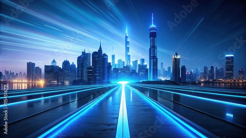 futuristic cityscape at dusk with a long blue light stripe running along the horizon