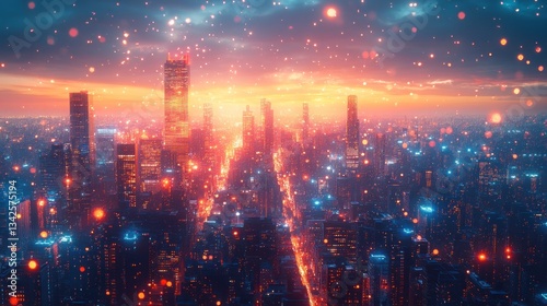 Futuristic Cityscape at Sunset: A Digital Painting of a Vibrant Metropolis