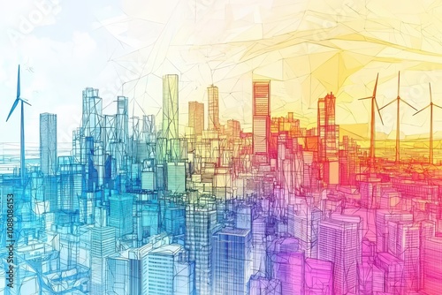 Futuristic Cityscape Design with Vivid Geometric Patterns and Wind Turbines Illustrating Sustainable Urban Development in a Colorful Aesthetic
