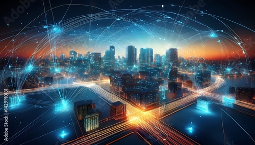 Futuristic Cityscape with Digital Connections and Network Lines at Dusk Overlooking Skyscrapers
