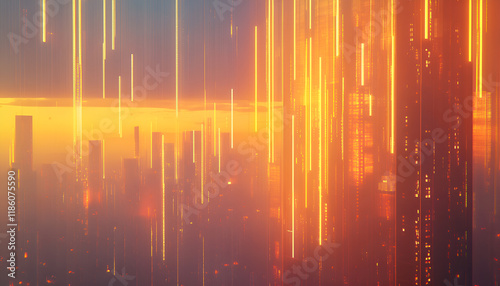 Futuristic cityscape with glowing lights at dusk