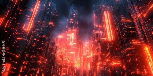 Futuristic Cityscape with Glowing Red Lights