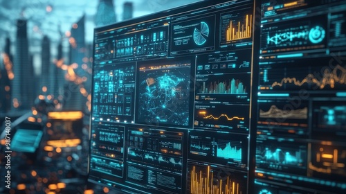 Futuristic computer screen with various data and charts.