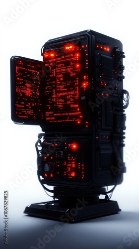 Futuristic computer tower with glowing red lights, isolated on a white background.