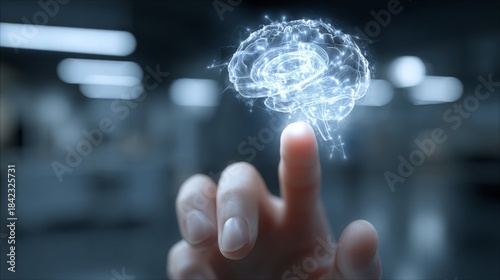 Futuristic concept of technology with a digital brain hovering above a finger.