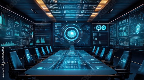 Futuristic Conference Room with Advanced Data Visualization Technology
