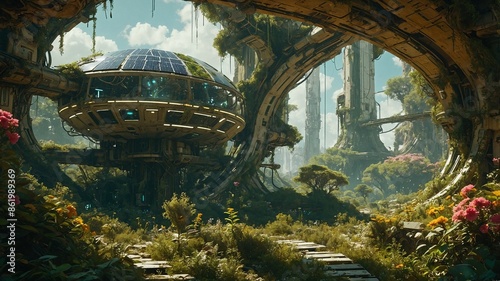 Futuristic construction lost in time and surrounded by grass and plants , fantasy scene