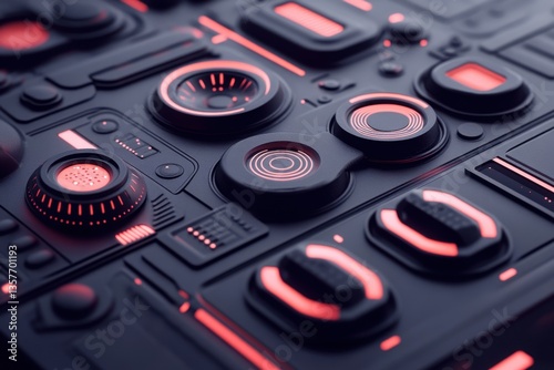Futuristic control panel glowing with red lights in dark environment