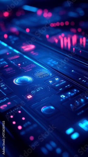 Futuristic control panel illuminated in and lights with intricate designs and displays