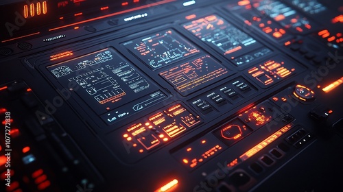 Futuristic control panel with glowing orange and red lights.