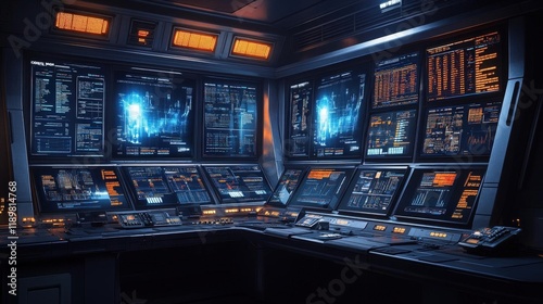 Futuristic Control Panel with Glowing Screens and Digital Interface
