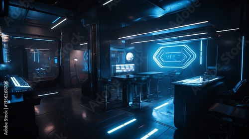 Futuristic Cyberpunk Bar Interior with Neon Lighting and Sleek Design