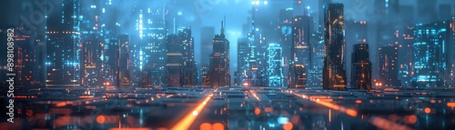Futuristic Cyberpunk Cityscape with Neon Lights and Skyscrapers at Night