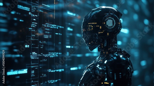 Futuristic cyborg analyzing digital data streams