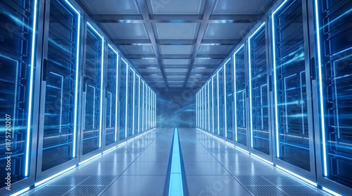 Futuristic data center corridor with glowing blue server racks and modern infrastructure