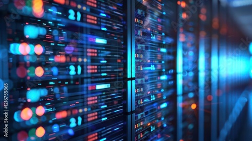 Futuristic data center showcasing vibrant server racks with illuminated components and cables