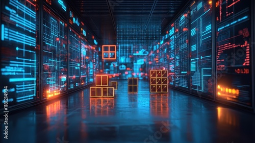 Futuristic data center with glowing digital screens and illuminated blocks in a high-tech environment