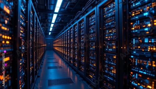 Futuristic Data Center with Glowing LED Server Racks – High-Tech Network Infrastructure.