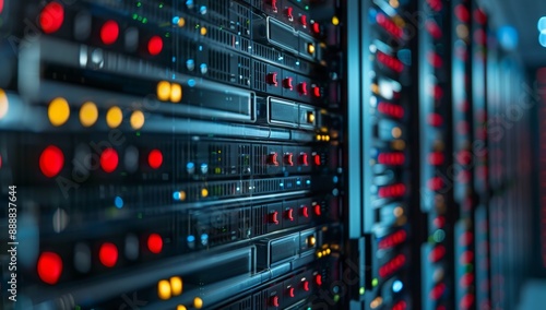 Futuristic data center with rackmounted servers and blinking lights