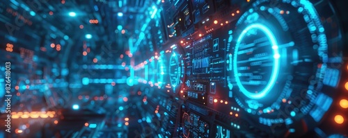 Futuristic data stream with glowing neon elements and digital symbols, showcasing advanced technology and cyber connectivity.