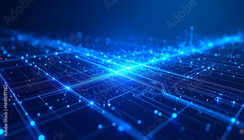 Futuristic data transmission and network communication concept. Digital technology abstract background with glowing blue lights.