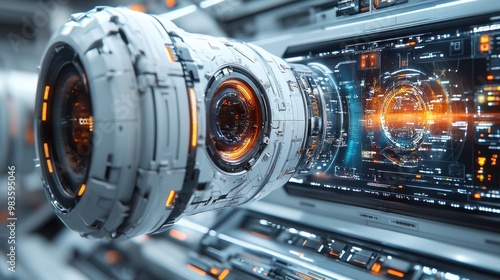 Futuristic device with glowing elements in a high-tech environment.