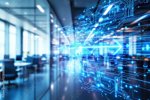 Futuristic digital circuit with glowing blue light arrow in modern office background.