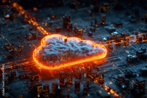 Futuristic digital cloud technology concept with glowing orange outline over cityscape representing cloud computing and data storage innovation