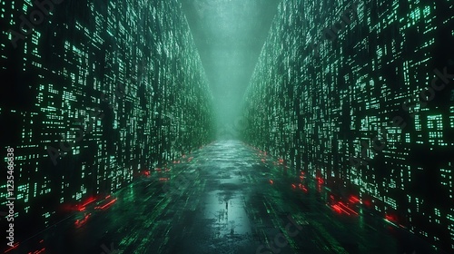 Futuristic digital corridor with glowing green code walls and red light trails.