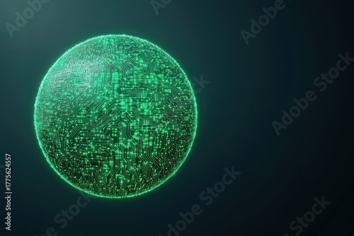 Futuristic digital globe with glowing green circuit patterns on a dark background representing technology and innovation themes