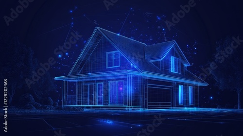 Futuristic Digital House Design with Blue Neon Outline and Trees