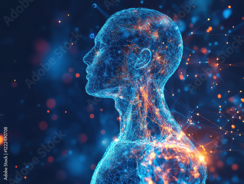 Futuristic digital human anatomy concept with glowing neural connections and abstract data particles representing artificial intelligence and advanced biointerface systems