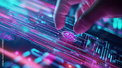 Futuristic digital interface with vibrant colors and hand interaction, showcasing advanced technology and holographic elements