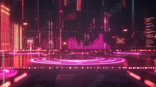 Futuristic digital landscape with vibrant neon lights and data visualizations.