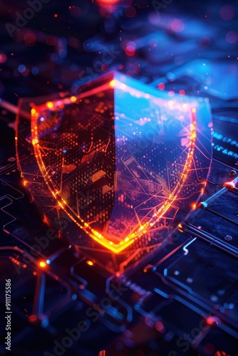 Futuristic Digital Shield with Neon Lights on Circuit Board Background Representing Cybersecurity and Data Protection
