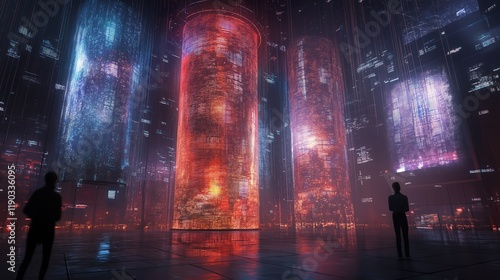 Futuristic Digital Space With Vibrant Holographic Towers Displaying Complex Data in a Sci-Fi Environment
