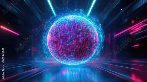 Futuristic digital sphere surrounded by vibrant neon lights, creating an immersive sci-fi atmosphere in a virtual environment.