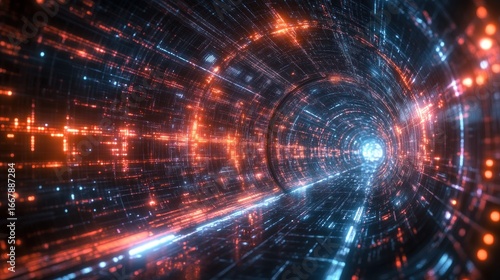 Futuristic Digital Tunnel Showing Glowing Data Streams and Network Connections