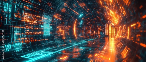 Futuristic digital tunnel with glowing orange and blue circuit-like patterns and illuminated grid structures creating a high-tech atmosphere