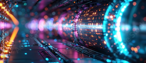 Futuristic Digital Tunnel with Streaming Data and Neon Lights