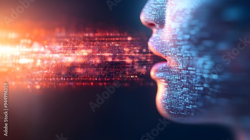 Futuristic double exposure image, speech recognition software and soundwaves merging with machine learning codes, glowing digital matrix background,