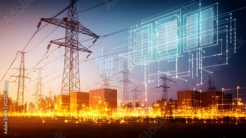 Futuristic energy grid featuring a glowing holographic battery network that optimizes renewable power from wind turbines and solar farms