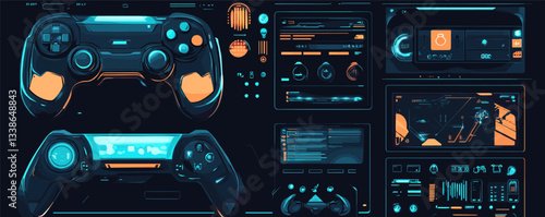 Futuristic gaming control panels with game controllers in neon blue and orange lighting.