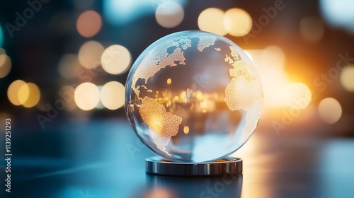 Futuristic Glass Globe in Vibrant City Lights with Global Connection Concept : Generative AI