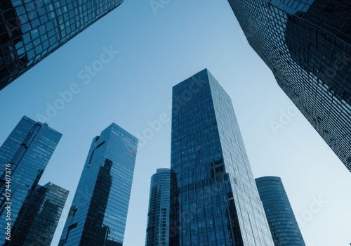 Futuristic Glass Skyscrapers with Blue Reflections in Modern Business District